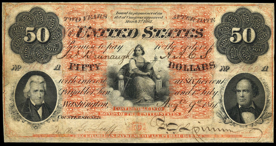 | See Also | If your note doesn't match try: 1. 1863 $50 Interest Bearing Note 2. 1864 $50 Interest Bearing Note 3. 1865 $50 Interest Bearing Note 4. 1864 $50 Compound Interest Treasury Note 5. 1862 $50 Legal Tender 6. 1863 $50 Legal Tender |