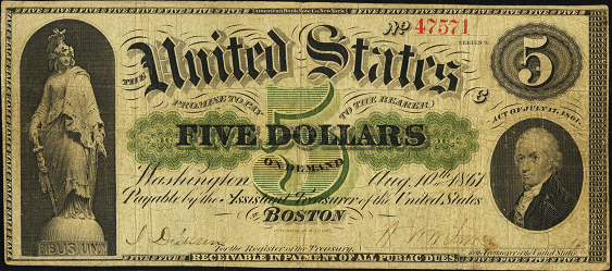 | See Also | If your note doesn't match try: 1. 1864 $5 Interest Bearing Note 2. 1862 $5 Legal Tender 3. 1863 $5 Legal Tender 4. 1869 $5 Legal Tender 5. 1863 $5 National Bank Notes |
