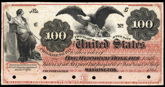 | See Also | If your note doesn't match try: 1. 1863 $100 Interest Bearing Note 2. 1864 $100 Interest Bearing Note 3. 1865 $100 Interest Bearing Note 4. 1863 $100 Compound Interest Treasury Note 5. 1864 $100 Compound Interest Treasury Note 6. 1863 $100 Gold Certificate |