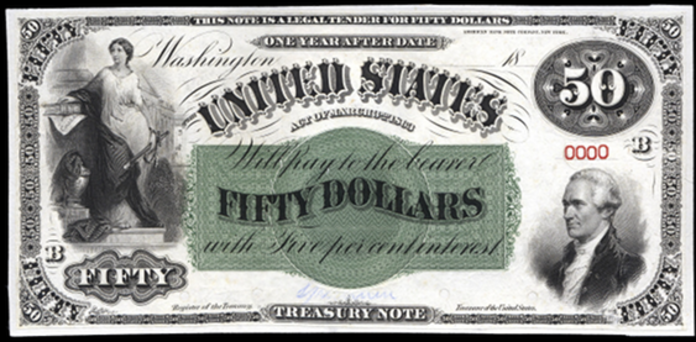 | See Also | If your note doesn't match try: 1. 1861 $50 Interest Bearing Note 2. 1864 $50 Interest Bearing Note 3. 1865 $50 Interest Bearing Note 4. 1864 $50 Compound Interest Treasury Note 5. 1862 $50 Legal Tender 6. 1863 $50 Legal Tender |