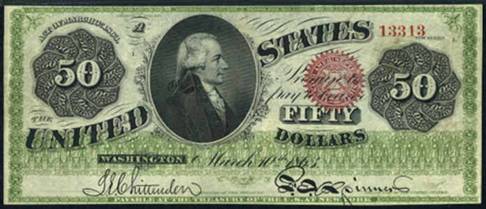 | See Also | If your note doesn't match try: 1. 1862 $50 Legal Tender 2. 1869 $50 Legal Tender 3. 1864 $50 Compound Interest Treasury Note 4. 1861 $50 Interest Bearing Note 5. 1863 $50 Interest Bearing Note 6. 1864 $50 Interest Bearing Note |