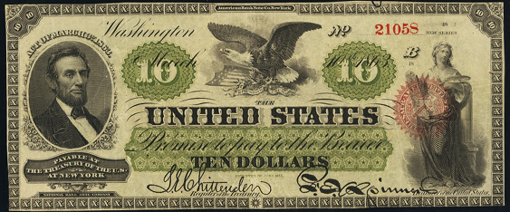 | See Also | If your note doesn't match try: 1. 1862 $10 Legal Tender 2. 1869 $10 Legal Tender 3. 1861 $10 Demand Note 4. 1863 $10 Compound Interest Treasury Note 5. 1864 $10 Compound Interest Treasury Note 6. 1864 $10 Interest Bearing Note 7. 1863 $10 Interest Bearing Note |