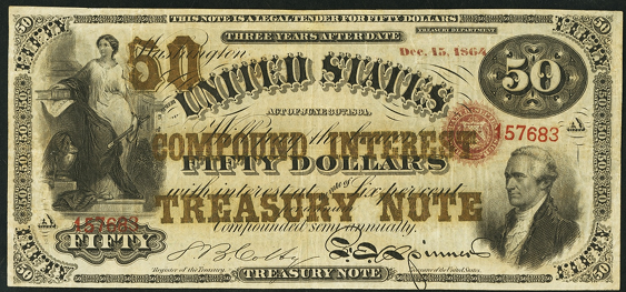 | See Also | If your note doesn't match try: 1. 1861 $50 Interest Bearing Note 2. 1863 $50 Interest Bearing Note 3. 1864 $50 Interest Bearing Note 4. 1865 $50 Interest Bearing Note 5. 1862 $50 Legal Tender 6. 1863 $50 Legal Tender |
