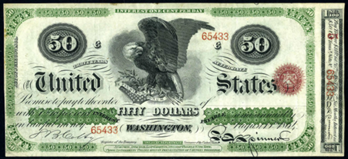 | See Also | If your note doesn't match try: 1. 1861 $50 Interest Bearing Note 2. 1863 $50 Interest Bearing Note 3. 1865 $50 Interest Bearing Note 4. 1864 $50 Compound Interest Treasury Note 5. 1862 $50 Legal Tender 6. 1863 $50 Legal Tender |