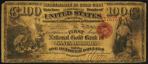 | See Also | If your note doesn't match try: 1. 1875 $100 The National Gold Bank Note of California 2. 1873 $100 The National Gold Bank Note of California 3. 1874 $100 The National Gold Bank Note of California 4. 1872 $100 The National Gold Bank Note of California 5. 1875 $100 Gold Certificate 6. 1865 $100 Interest Bearing Note 7. 1869 $100 Legal Tender |