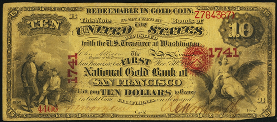 | Example Rarity | First National Gold Bank San Francisco, signatures Allison - Spinner with Red seal. Comment: Extreme rarity, a show-stopping note. Can appraise on request. 4 |