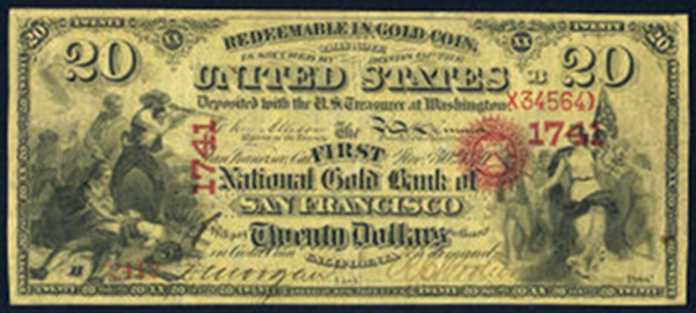 | Example Rarity | First National Gold Bank Oakland, signatures Allison - Spinner with Red seal. Comment: One of a few known or unique. Profound rarity. Can appraise on request. 5 |