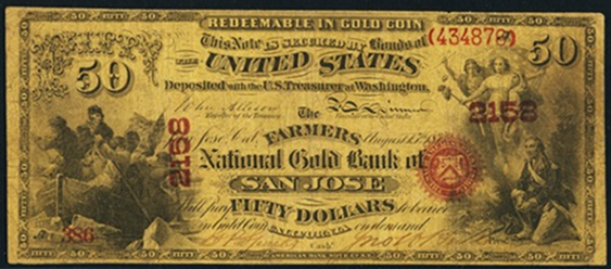 | See Also | If your note doesn't match try: 1. 1870 $50 The National Gold Bank Note of California 2. 1875 $50 The National Gold Bank Note of California 3. 1872 $50 The National Gold Bank Note of California 4. 1873 $50 The National Gold Bank Note of California 5. 1882 $50 Gold Certificate |