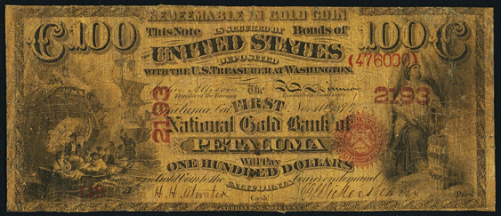 | See Also | If your note doesn't match try: 1. 1870 $100 The National Gold Bank Note of California 2. 1875 $100 The National Gold Bank Note of California 3. 1873 $100 The National Gold Bank Note of California 4. 1872 $100 The National Gold Bank Note of California 5. 1875 $100 Gold Certificate 6. 1882 $100 Gold Certificate |