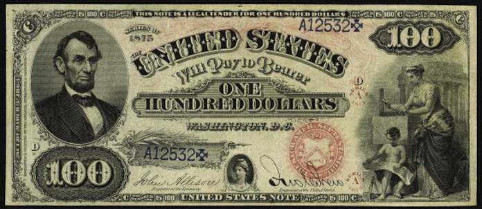 One Hundred Dollar Notes › Legal Tenders › 1875 One Hundred Dollar Legal Tender Or United States Notes