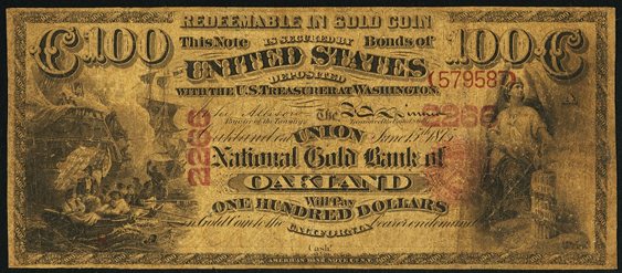 | Example Rarity | Union National Gold Bank Oakland, signatures Allison - Spinner with Red seal. Comment: One of a few known or unique. Profound rarity. Can appraise on request. 5 |