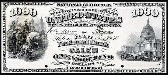| See Also | If your note doesn't match try: 1. 1875 $1000 Gold Certificate 2. 1882 $1000 Gold Certificate 3. 1878 $1000 Legal Tender 4. 1880 $1000 Legal Tender |