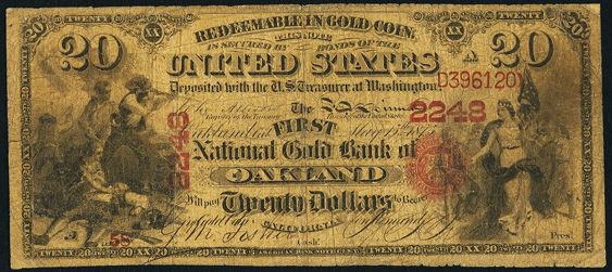 | Varieties | 5 Varieties. Will try to identify the note from your image. 1. City: San Francisco Bank: First National Gold Bank 2. City: Stockton Bank: First National Gold Bank 3. City: Petaluma Bank: First National Gold Bank 4. City: Oakland Bank: First National Gold Bank 5. City: Oakland Bank: Union National Gold Bank |
