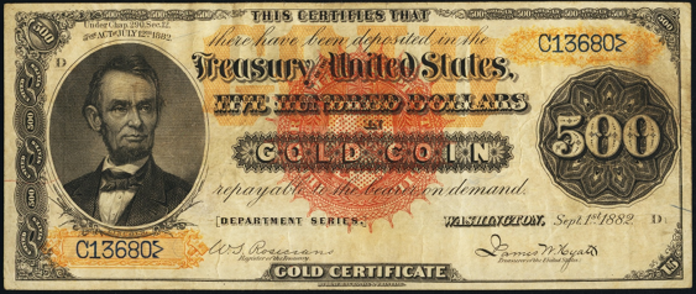 | Example Rarity | Countersigned by Hand Thomas C Acton Payable at New York Bust of Lincoln to left Gold Colored Reverse, signatures Bruce - Gilfillan with Brown seal. Comment: One of a few known or unique. Profound rarity. Can appraise on request. 5 |