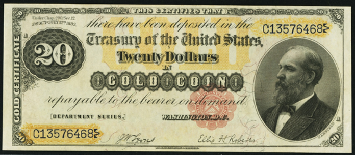 | Example Rarity | Countersigned by Hand Thomas C Acton Payable at New York Bust of Garfield to right Gold Colored Reverse, signatures Bruce - Gilfillan with Brown seal. Comment: One of a few known or unique. Profound rarity. Can appraise on request. 5 |