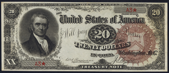 | Example Rarity | Type Note, signatures Rosecrans - Nebeker with Brown seal. Comment: Extreme rarity, a show-stopping note. Can appraise on request. 4 |