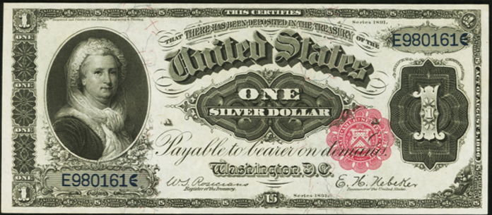 | See Also | If your note doesn't match try: 1. 1886 $1 Silver Certificates 2. 1896 $1 Silver Certificates 3. 1899 $1 Silver Certificates 4. 1890 $1 Treasury Note |