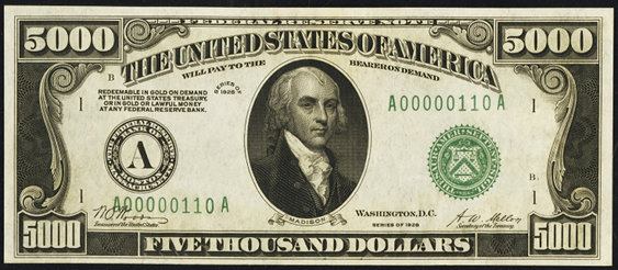| See Also | If your note doesn't match try: 1. 1934 $5000 Federal Reserve Note 2. 1934A $5000 Federal Reserve Note 3. 1934B $5000 Federal Reserve Note 4. 1928 $5000 Gold Certificate |
