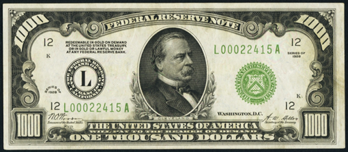 | See Also | If your note doesn't match try: 1. 1934 $1000 Federal Reserve Note 2. 1934A $1000 Federal Reserve Note 3. 1934C $1000 Federal Reserve Note 4. 1928 $1000 Gold Certificate 5. 1934 $1000 Gold Certificate |