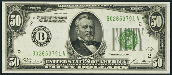 | See Also | If your note doesn't match try: 1. 1928 $50 Federal Reserve Note 2. 1928A $50 Federal Reserve Note 3. 1934 $50 Federal Reserve Note 4. 1934A $50 Federal Reserve Note 5. 1934B $50 Federal Reserve Note 6. 1934C $50 Federal Reserve Note 7. 1934D $50 Federal Reserve Note |
