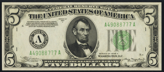 | See Also | If your note doesn't match try: 1. 1934 $5 WW2 Brown Seal 2. 1934A $5 WW2 Brown Seal 3. 1934A $5 WW2 Yellow Seal 4. 1934 $5 Silver Certificates 5. 1934A $5 Silver Certificates 6. 1934B $5 Silver Certificates 7. 1934C $5 Silver Certificates 8. 1934D $5 Silver Certificates |