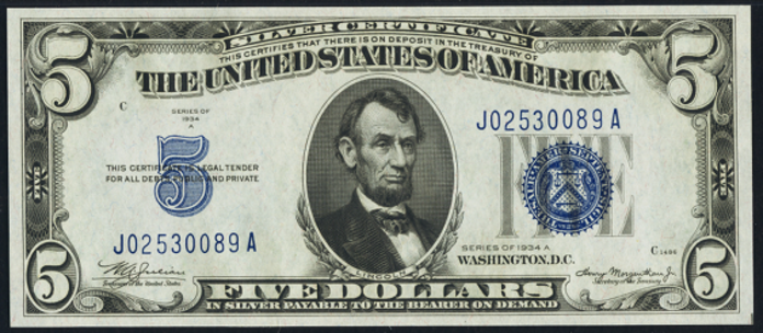| See Also | If your note doesn't match try: 1. 1934 $5 WW2 Brown Seal 2. 1934A $5 WW2 Brown Seal 3. 1934A $5 WW2 Yellow Seal 4. 1934 $5 Silver Certificates 5. 1934A $5 Silver Certificates 6. 1934B $5 Silver Certificates 7. 1934C $5 Silver Certificates 8. 1934D $5 Silver Certificates |