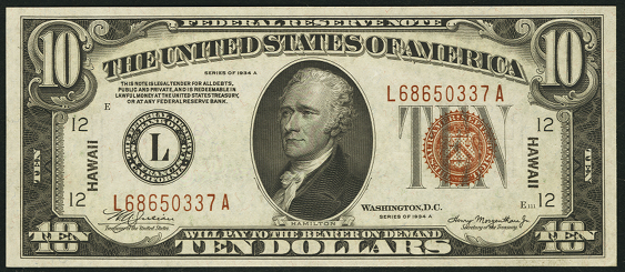 1934a Ten Dollar Federal Reserve Note1934a Ten Dollar Federal Reserve Notes Hawaii Brown Note