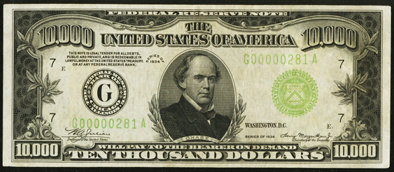 | See Also | If your note doesn't match try: 1. 1934 $10000 Gold Certificate 2. 1934 $10000 Federal Reserve Note 3. 1934A $10000 Federal Reserve Note 4. 1934B $10000 Federal Reserve Note |