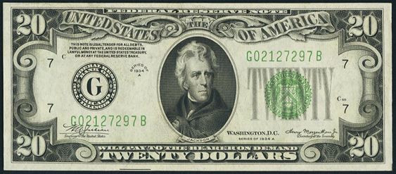 | See Also | If your note doesn't match try: 1. 1934 $20 WW2 Brown Seal 2. 1934A $20 WW2 Brown Seal 3. 1929 $20 National Bank Notes 4. 1934 $20 Federal Reserve Note 5. 1934A $20 Federal Reserve Note 6. 1934B $20 Federal Reserve Note 7. 1934C $20 Federal Reserve Note |