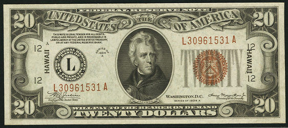 | See Also | If your note doesn't match try: 1. 1934 $20 WW2 Brown Seal 2. 1934A $20 WW2 Brown Seal 3. 1929 $20 Federal Reserve Bank Note 4. 1934 $20 Federal Reserve Note 5. 1934A $20 Federal Reserve Note 6. 1934B $20 Federal Reserve Note 7. 1934C $20 Federal Reserve Note |