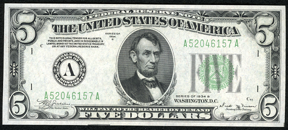 | See Also | If your note doesn't match try: 1. 1934 $5 WW2 Brown Seal 2. 1934A $5 WW2 Brown Seal 3. 1934A $5 WW2 Yellow Seal 4. 1934 $5 Silver Certificates 5. 1934A $5 Silver Certificates 6. 1934B $5 Silver Certificates 7. 1934C $5 Silver Certificates 8. 1934D $5 Silver Certificates |