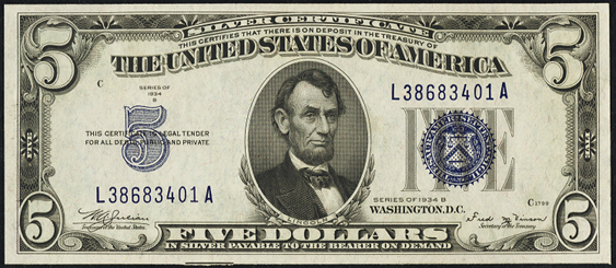 | See Also | If your note doesn't match try: 1. 1934 $5 WW2 Brown Seal 2. 1934A $5 WW2 Brown Seal 3. 1934A $5 WW2 Yellow Seal 4. 1934 $5 Silver Certificates 5. 1934A $5 Silver Certificates 6. 1934B $5 Silver Certificates 7. 1934C $5 Silver Certificates 8. 1934D $5 Silver Certificates |