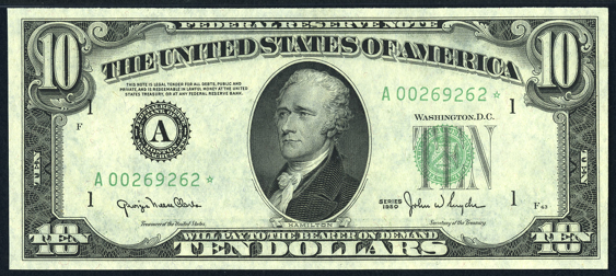 | See Also | If your note doesn't match try: 1. 1950 $10 Federal Reserve Note 2. 1950A $10 Federal Reserve Note 3. 1950B $10 Federal Reserve Note 4. 1950C $10 Federal Reserve Note 5. 1950D $10 Federal Reserve Note 6. 1950E $10 Federal Reserve Note 7. 1953 $10 Silver Certificates 8. 1953A $10 Silver Certificates |