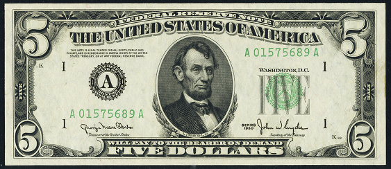 | See Also | If your note doesn't match try: 1. 1950 $5 Federal Reserve Note 2. 1950A $5 Federal Reserve Note 3. 1950B $5 Federal Reserve Note 4. 1950C $5 Federal Reserve Note 5. 1950D $5 Federal Reserve Note 6. 1950E $5 Federal Reserve Note 7. 1953 $5 Legal Tender 8. 1953A $5 Legal Tender |