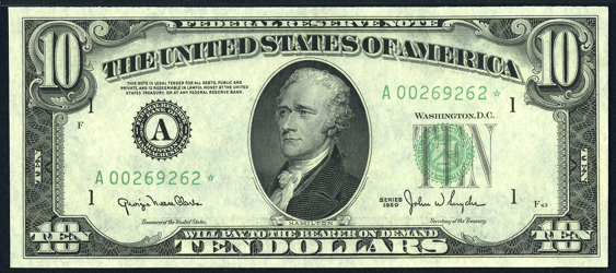 | See Also | If your note doesn't match try: 1. 1950 $10 Federal Reserve Note 2. 1950A $10 Federal Reserve Note 3. 1950B $10 Federal Reserve Note 4. 1950C $10 Federal Reserve Note 5. 1950D $10 Federal Reserve Note 6. 1950E $10 Federal Reserve Note 7. 1953 $10 Silver Certificates 8. 1953A $10 Silver Certificates |