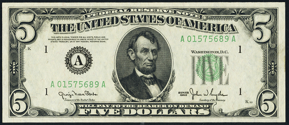 | See Also | If your note doesn't match try: 1. 1950 $5 Federal Reserve Note 2. 1950A $5 Federal Reserve Note 3. 1950B $5 Federal Reserve Note 4. 1950C $5 Federal Reserve Note 5. 1950D $5 Federal Reserve Note 6. 1950E $5 Federal Reserve Note 7. 1953 $5 Legal Tender 8. 1953A $5 Legal Tender |