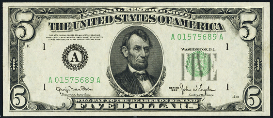 | See Also | If your note doesn't match try: 1. 1950 $5 Federal Reserve Note 2. 1950A $5 Federal Reserve Note 3. 1950B $5 Federal Reserve Note 4. 1950C $5 Federal Reserve Note 5. 1950D $5 Federal Reserve Note 6. 1950E $5 Federal Reserve Note 7. 1953 $5 Legal Tender 8. 1953A $5 Legal Tender |
