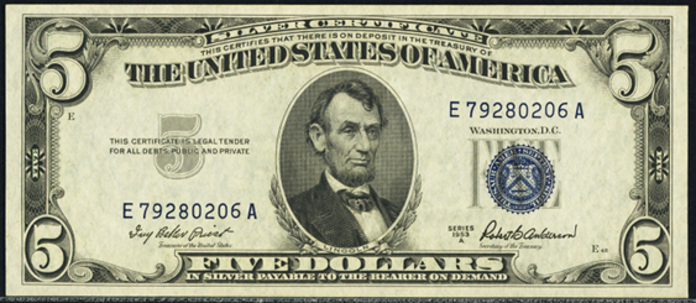 | See Also | If your note doesn't match try: 1. 1953 $5 Silver Certificates 2. 1953A $5 Silver Certificates 3. 1953B $5 Silver Certificates 4. 1953C $5 Silver Certificates 5. 1950 $5 Federal Reserve Note 6. 1950A $5 Federal Reserve Note 7. 1950B $5 Federal Reserve Note 8. 1950C $5 Federal Reserve Note |