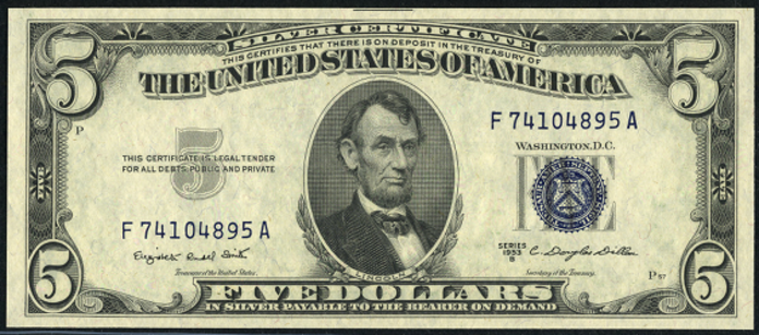 | See Also | If your note doesn't match try: 1. 1953 $5 Silver Certificates 2. 1953A $5 Silver Certificates 3. 1953B $5 Silver Certificates 4. 1953C $5 Silver Certificates 5. 1950 $5 Federal Reserve Note 6. 1950A $5 Federal Reserve Note 7. 1950B $5 Federal Reserve Note 8. 1950C $5 Federal Reserve Note |